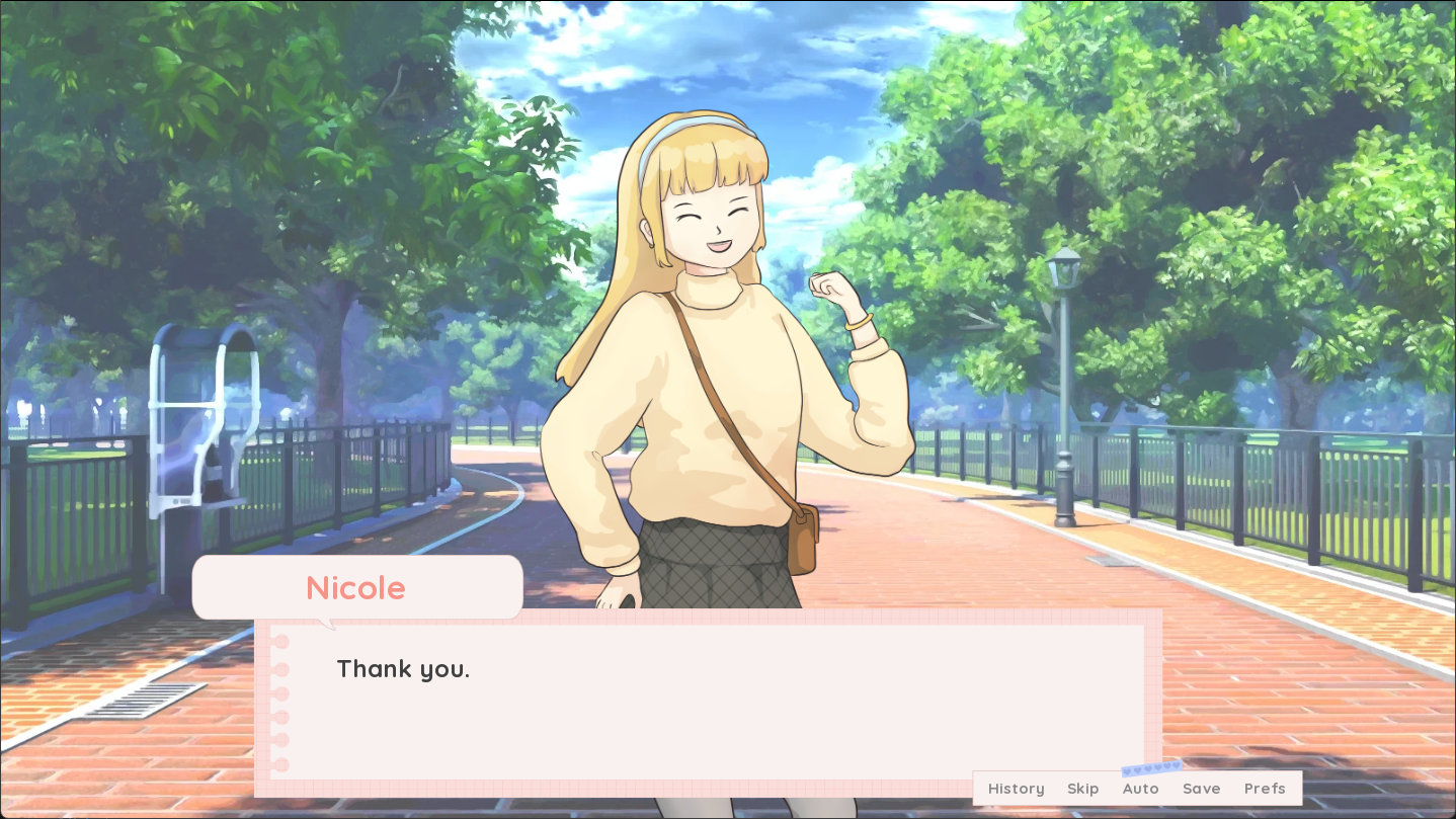 In fact, an original idea I had for this game was that you would play a minigame to make art for Nicole and it'll affect the story, kind of like the poem writing minigame in Doki Doki Literature Club. If this game gets a lot of interest, I'd love to make a long version of this game with my original ideas which includes the minigame, extra characters and a longer story.